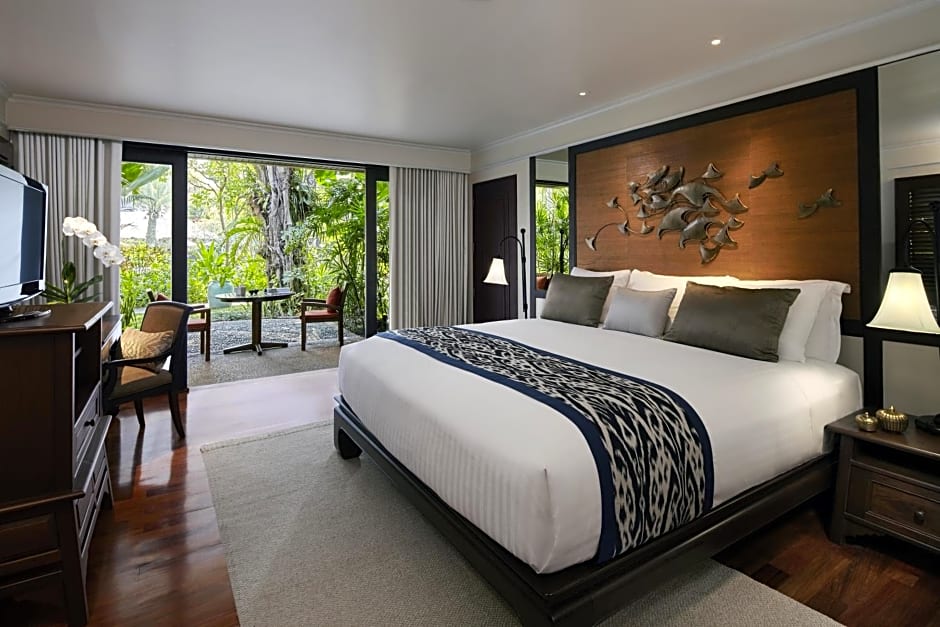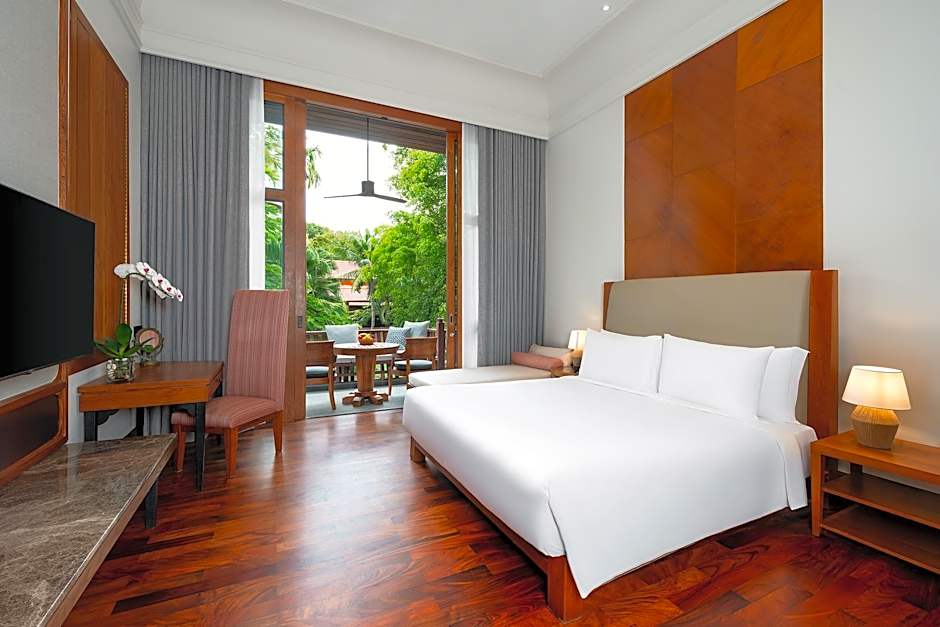 Club Anantara Garden View Suite is 689 square feet and includes a queen-size bed 150-154 width plus a sofa bed plus terrace, desk, cable tv, hairdryer, and safe.